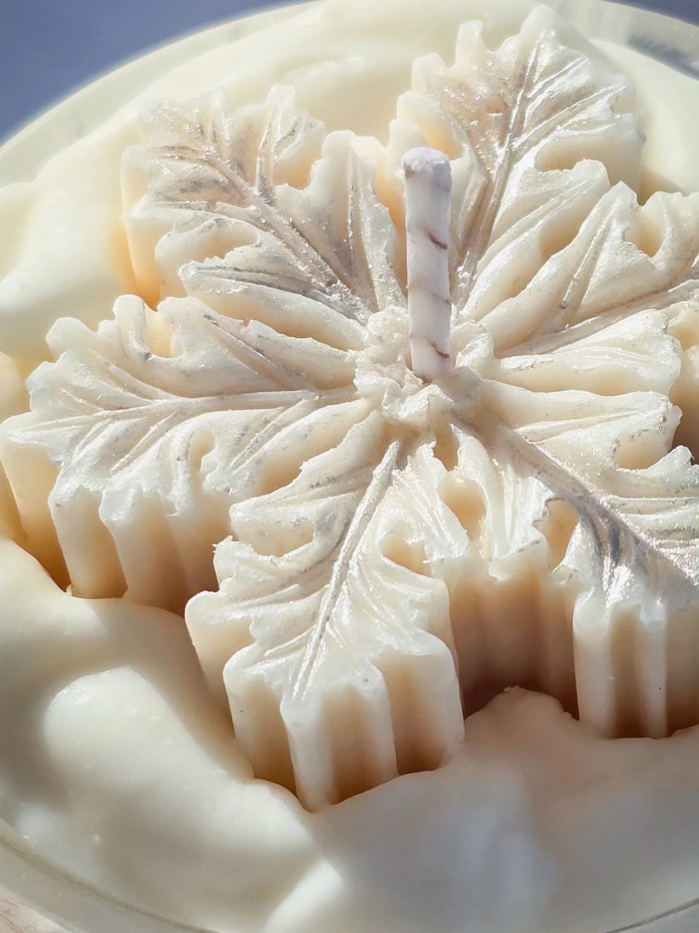Uma vela inspirada no charme da neve, com um “creme” super delicado e um floco esculpido à mão